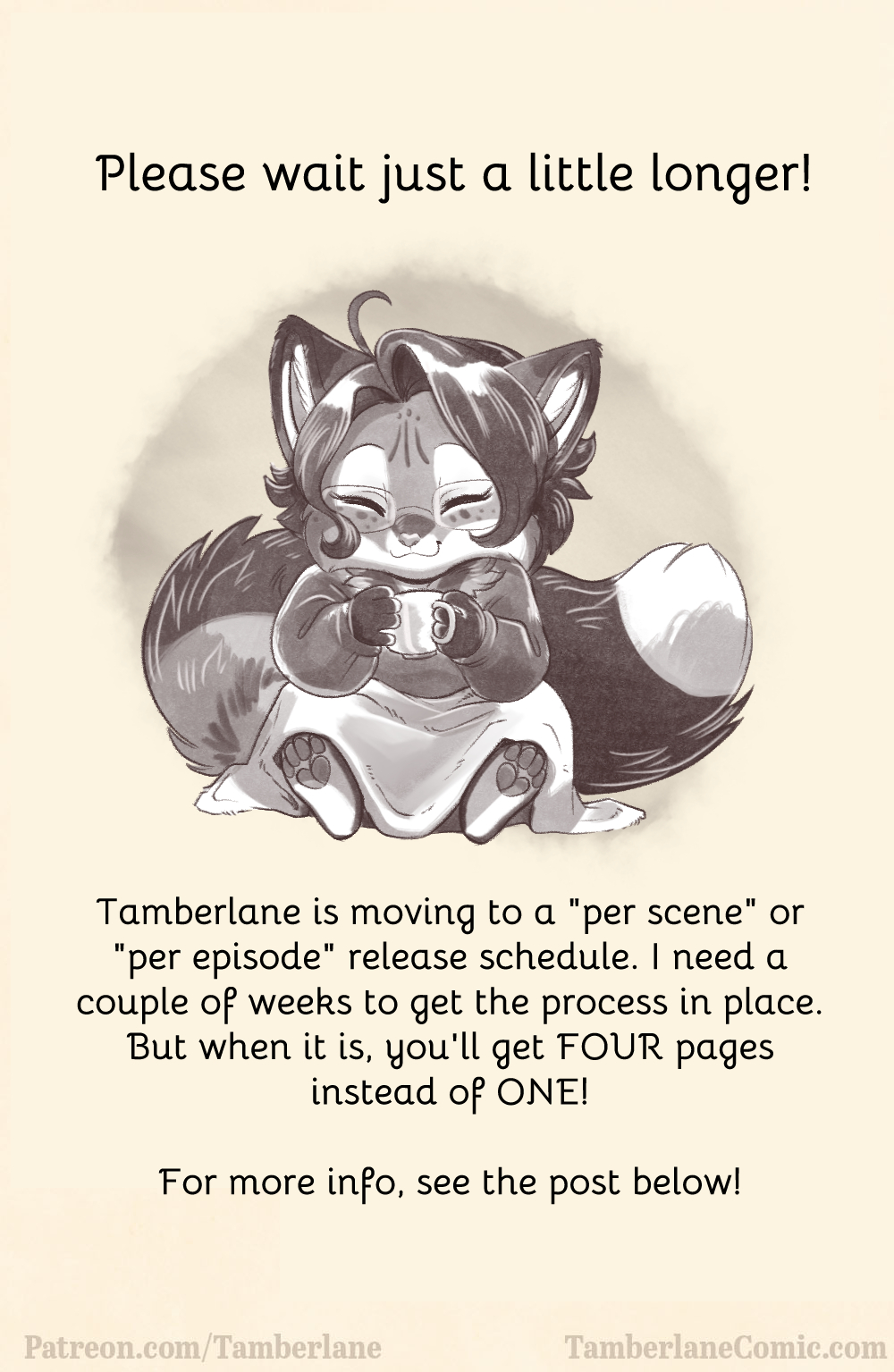 Tamberlane is moving to a "per scene" or "per episode" release schedule. I need a couple of weeks to get the process in place. But when it is, you'll get FOUR pages instead of ONE!